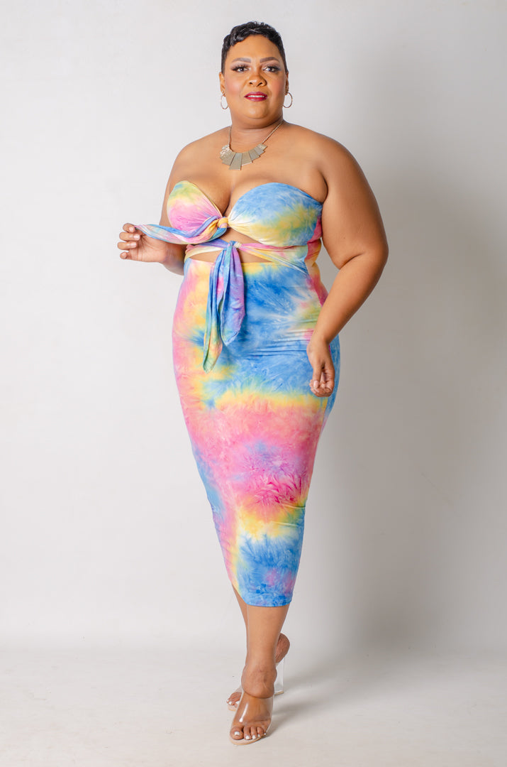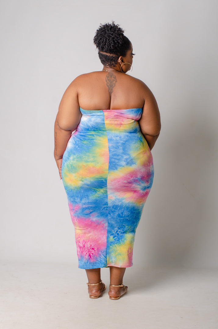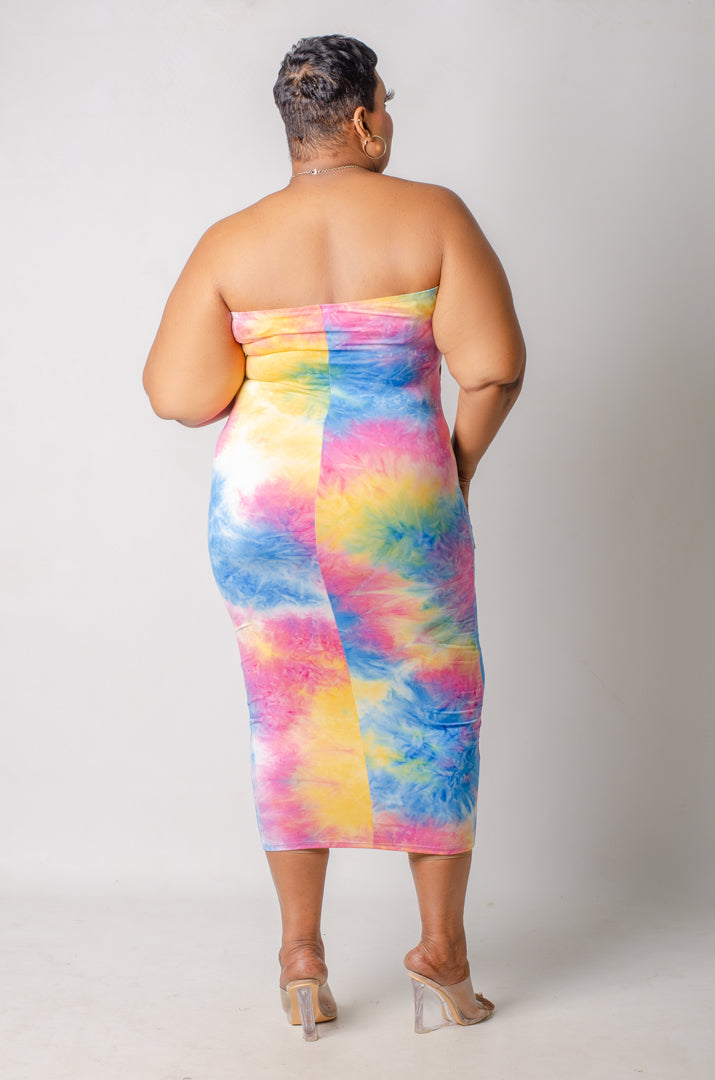 Get ready for some serious vacation vibes with this fun tie-dye midi-length dress. Featuring sexy double tie details and a strapless neckline with no closures, this beautiful body-con dress is perfect for those carefree, sunny days. Made from a soft and comfy material, you'll never want to take it off!