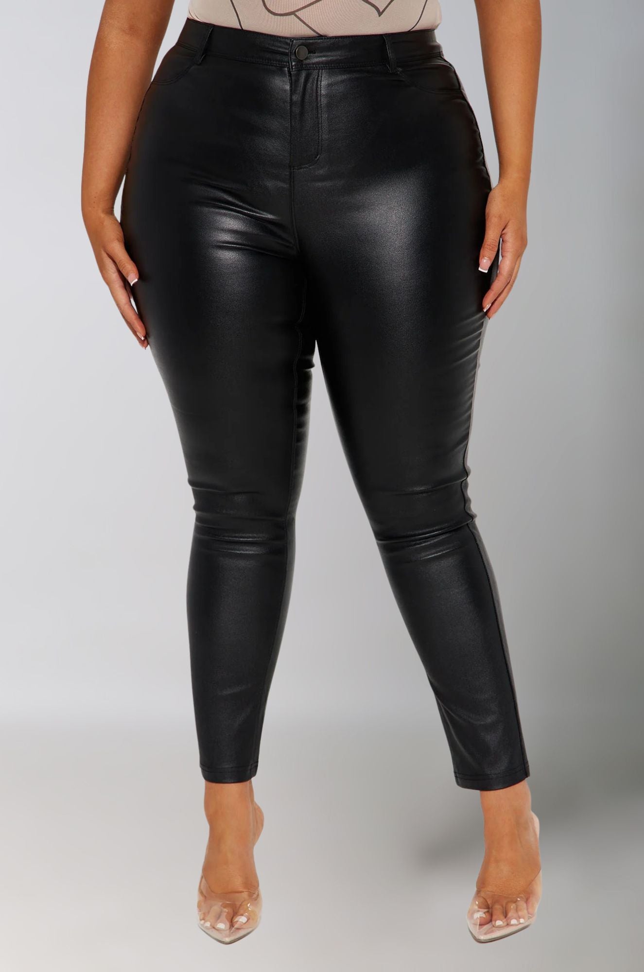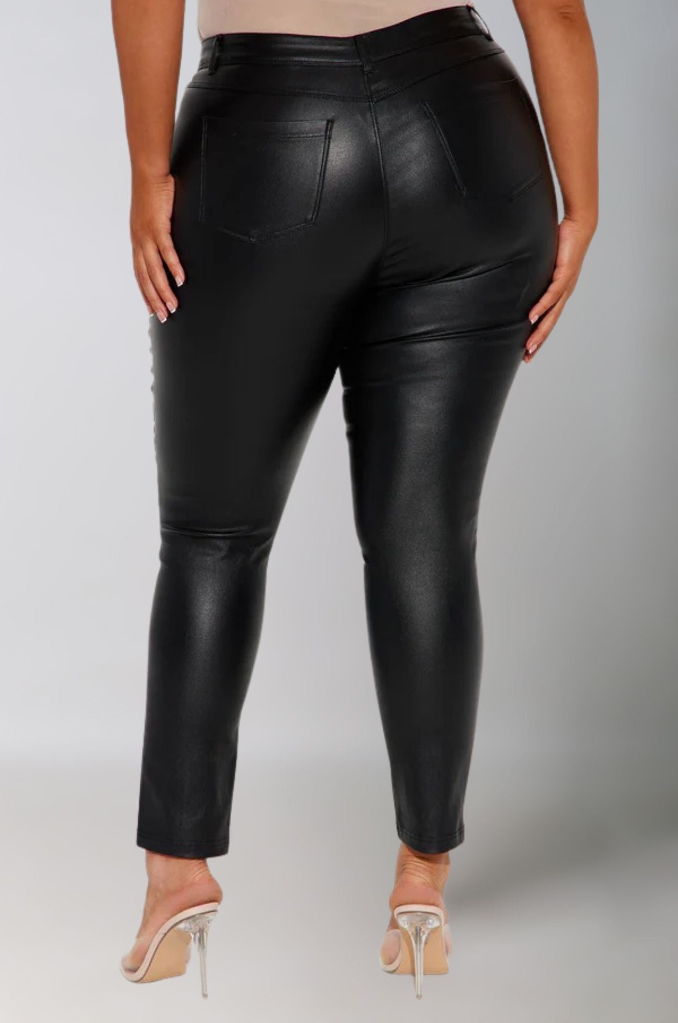 Details: Beautiful pleather pants with good stretch and structure. These pants have a 11.5" Rise and a 29.5" inseam. They’re super comfortable with a light sheen but is not shiny. Faux Front pockets and functional back pockets.