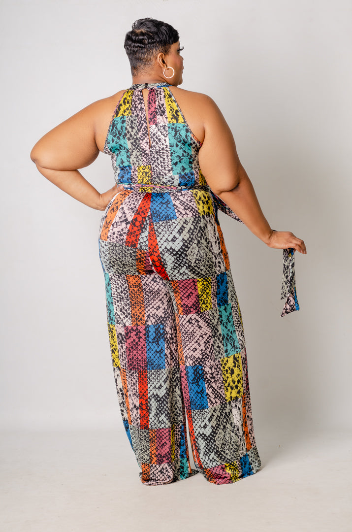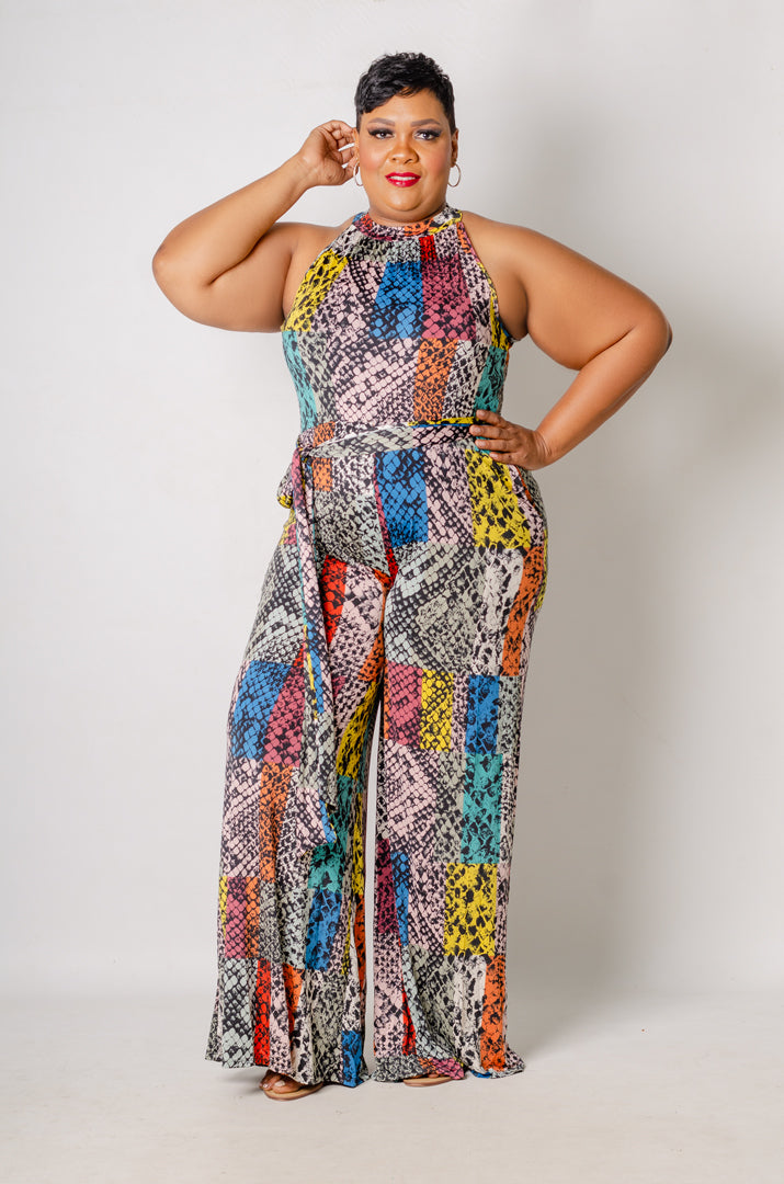 Details: Vibrant printed T-Halter / Racerback Jumpsuit with wide leg construction and pockets. Button and keyhole entry. Comes with a sash to cinch waistline.