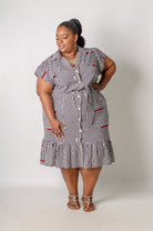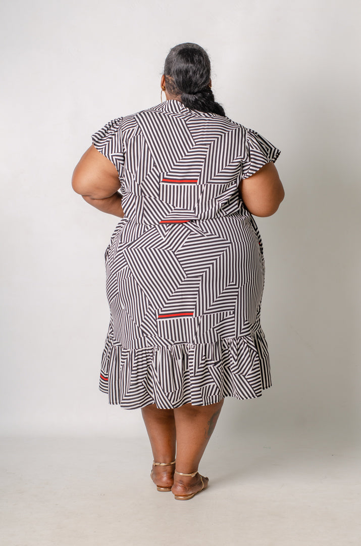 Step into bold confidence with the Metro Lines Dress – where structure meets flow. This button-down shirtdress features striking black-and-white geometric stripes with a touch of red accents that instantly catch the eye. Designed with short flutter sleeves, a tie waist for a customizable fit, and a playful ruffle hem, it’s the perfect mix of polished and fun.