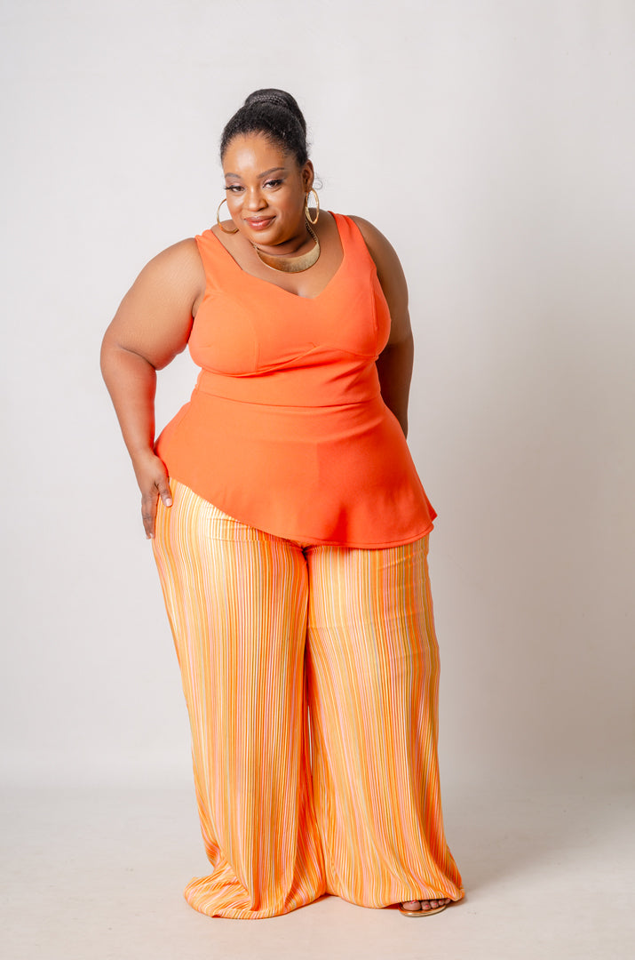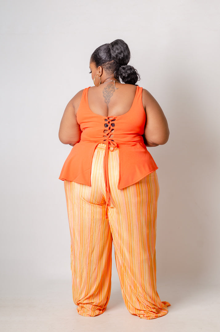 Details: Cute Peplum Top with Corset style back paired with vibrant plissé wide leg pants. Corset loop closure on top, no closures on pants (waist is elastic)