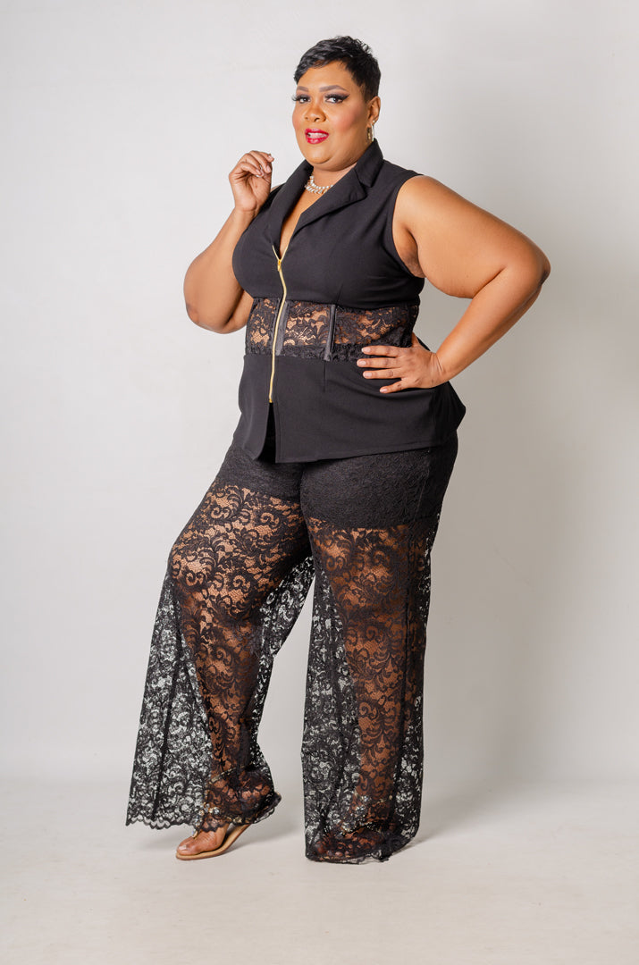 Details: Beautiful duo fabric pant set. Pants are wide leg lace pants with partial lining and an elastic waist. Top is a sleeveless jacket with plunge neckline and short zipper, a lace window, and a corseted back for a more customized fit at the waist.