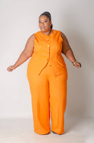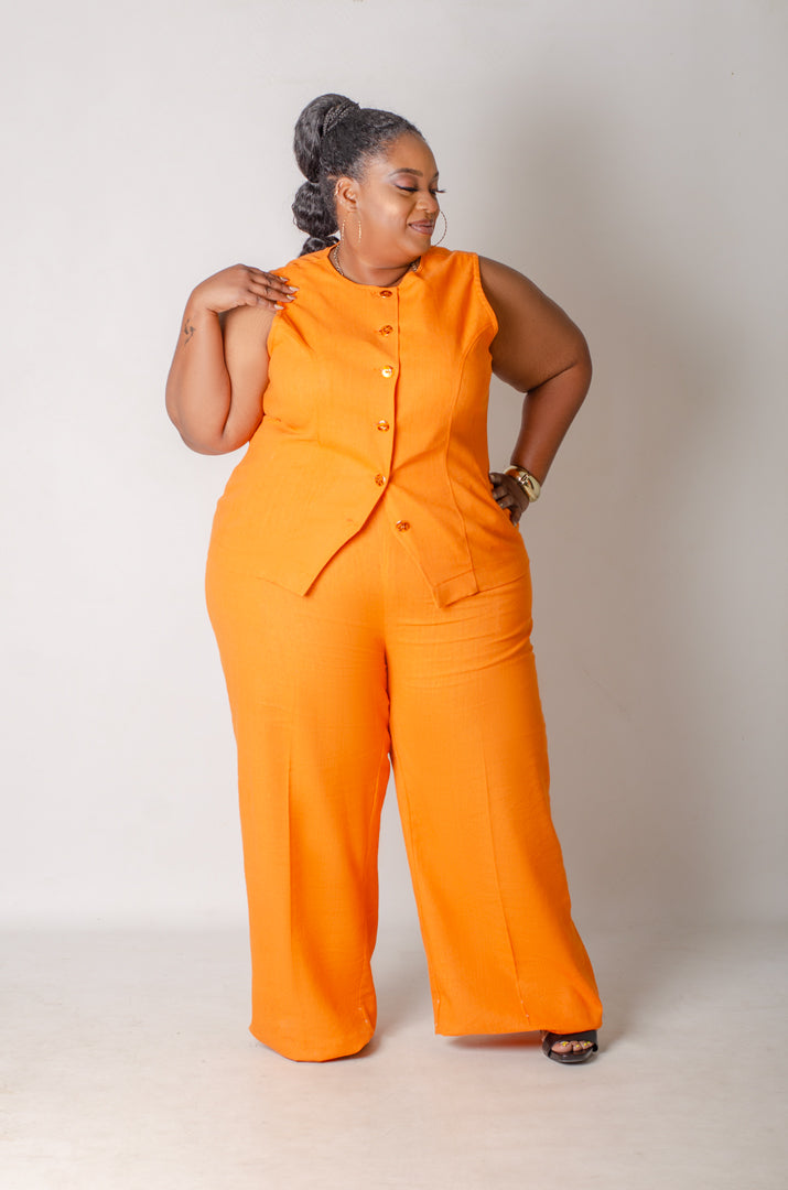 The Power Hour Set is for the woman who walks into the room and owns it. This bold tangerine linen co-ord set pairs a sleeveless button-front vest with tailored wide leg trousers for a look that is polished, powerful, and completely unforgettable. The collarless neckline and longline vest hem give it a sophisticated edge while the wide leg silhouette keeps things relaxed and runway ready at the same time. Bright, structured, and built for the woman who knows her worth, this set is not for the faint of heart.
