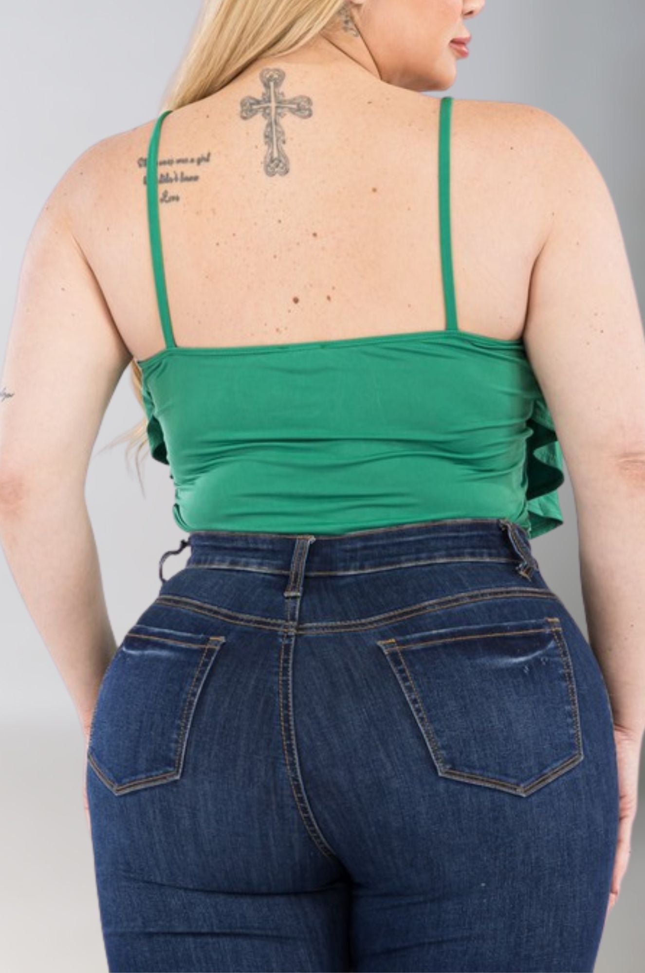 Details: Playful thin-strapped bodysuit with ruffle detail. Snap closure. Great under jeans, skirts or wide-leg pants.