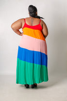 Turn every outing into a celebration with the Block Party Maxi. This playful color-blocked dress pops with bold shades of red, orange, pink, blue, and green. Designed with adjustable straps and a flowy silhouette, it’s as comfortable as it is eye-catching.