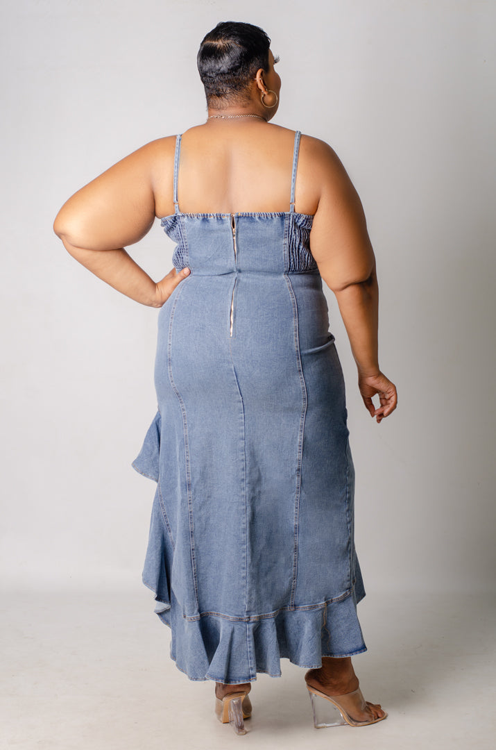 Details: Beautiful body-skimming v-neck denim dress with asymmetrical ruffle hem and thin straps. Zipper Entry.