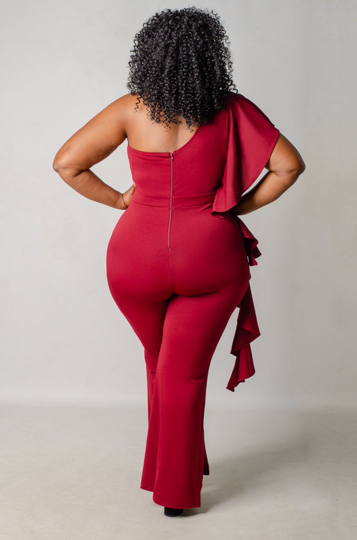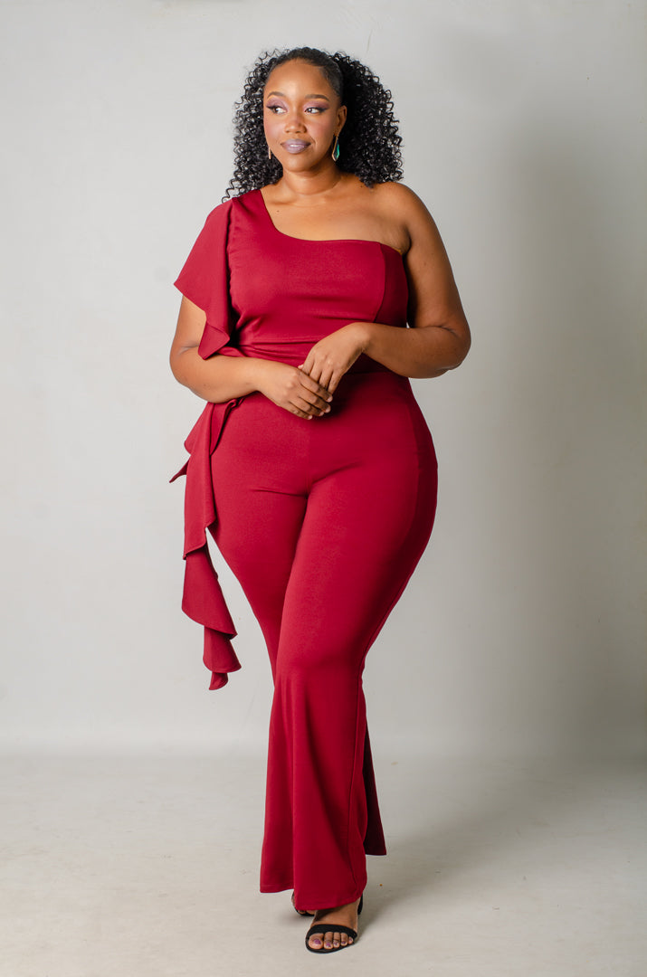 Details: One Shoulder Jumpsuit, Wide Leg, Ruffle detail, zipper entry