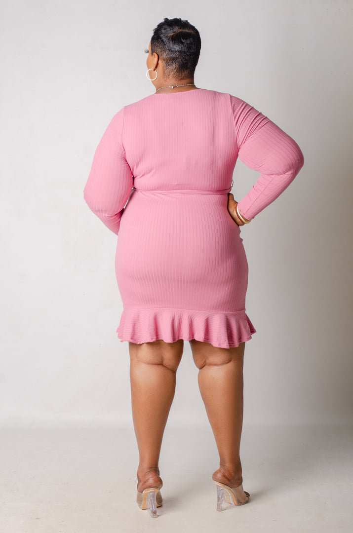 Details: Cute ribbed stretchy dress with light ruffle at hem. Long Sleeves, removable sash, surplice neckline. No closures - easy pull on design.