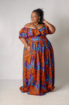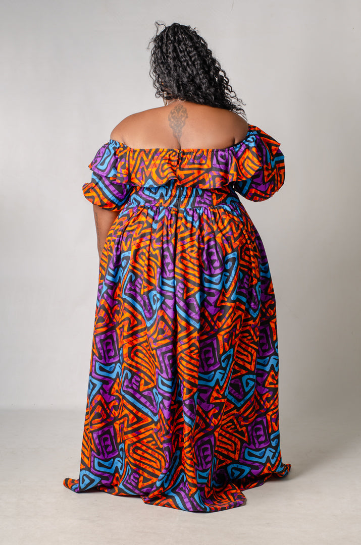 Shine in the Sarabi Maxi Dress. This stunning off-the-shoulder printed maxi dress features exquisite ruffle detailing along the wide V-neckline. The full gathered skirt elegantly reveals a mid-thigh slit as you walk, adding a touch of allure. The half sleeves are beautifully puffed and cinched for a flattering silhouette. For added versatility, this dress can also be worn on the shoulders if desired.