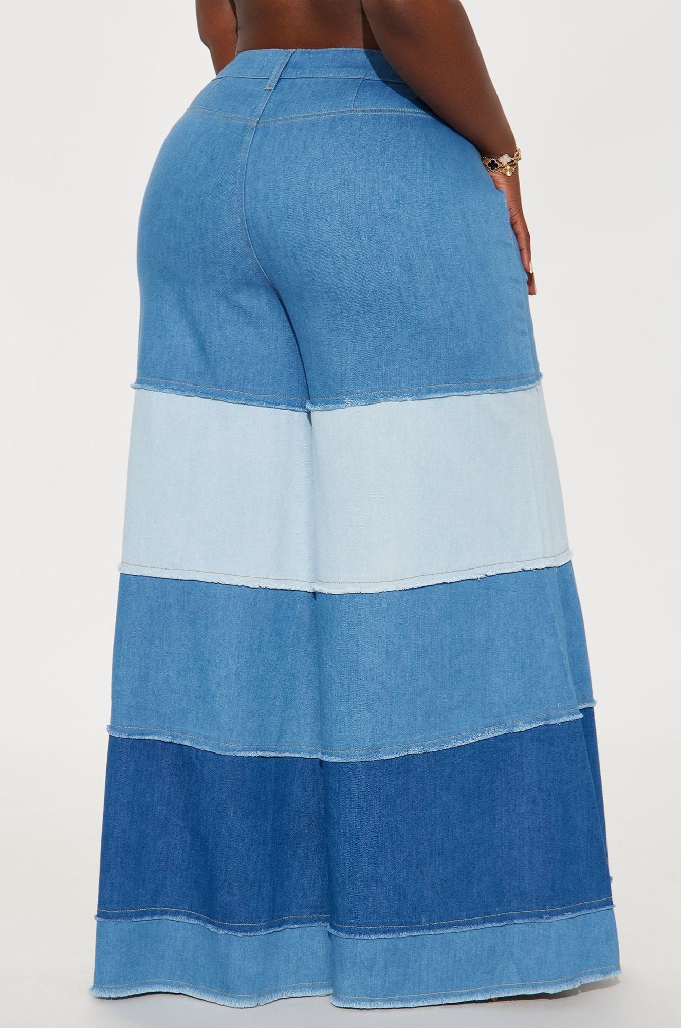 The Shades of Blue Wide Leg Jeans are not your average denim. These ultra wide leg beauties feature four graduating panels of lightweight chambray, from a soft light blue at the top to a soulful dark blue hem, each separated by raw frayed edges that give the whole look a cool, editorial finish. High waisted and structured, these jeans cinch at the waist and flow dramatically through the leg for a silhouette that is equal parts bold and beautiful. This is denim elevated.